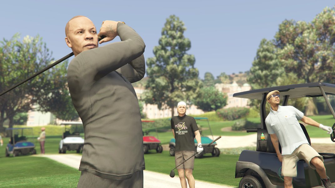- After the cutscene you'll be in the car with Dr. Dre and he'll play you a world premiere track. Enjoy it as you drive him back to the country club where his helecopter awaits.